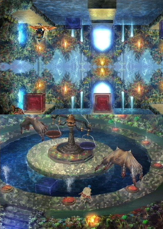 The entryway is is an odd location. There are three blue blocks and three red blocks that go from the ceiling to the floor depending on a certain setting. The Hero is located here, and gives you three important items for the puzzle located in Detourne. In the entryway, you can walk on the ceiling, and the blocks shift accordingly. You can find the key to the boss here, as well as the item Mirage Weed, a Quest Magnus.