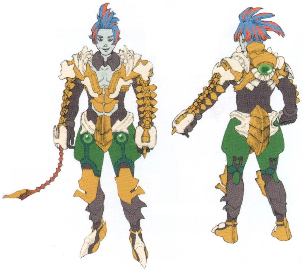 He and Ayme are often assigned together and both serve under Giacomo. He is a blue-skinned man who fights with two long whips hidden in his gauntlets. He's considered a wild joker, and often taunts his foes, but both he and Ayme are unswervingly loyal to Giacomo. It is unknown what his and Ayme's relationship is, other than being from the same village and subjected to the same experiments by the Empire.