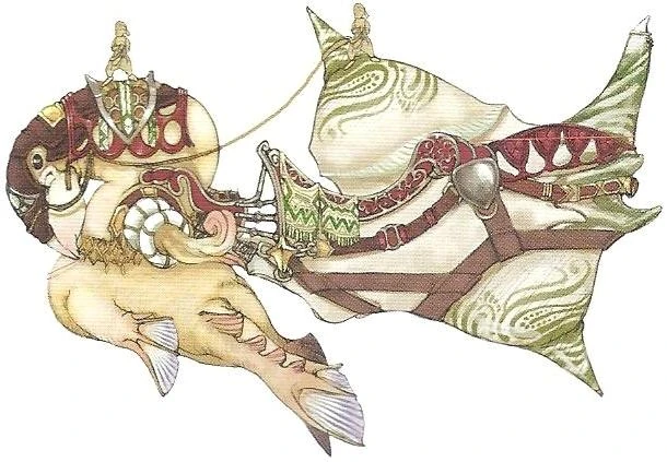 Like many forms transport in the world of Baten Kaitos, it consists of a carriage attached to a large, unnamed species of skyfish.